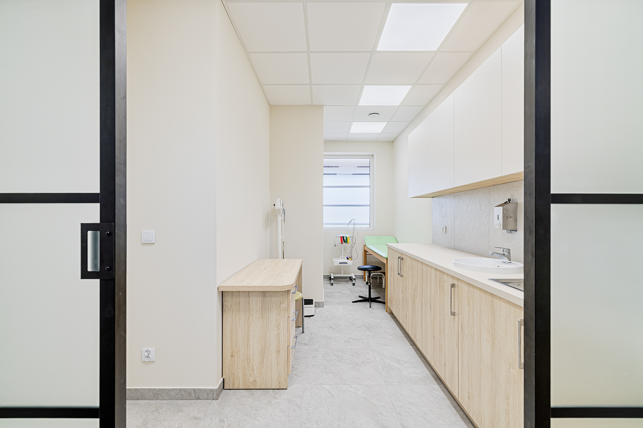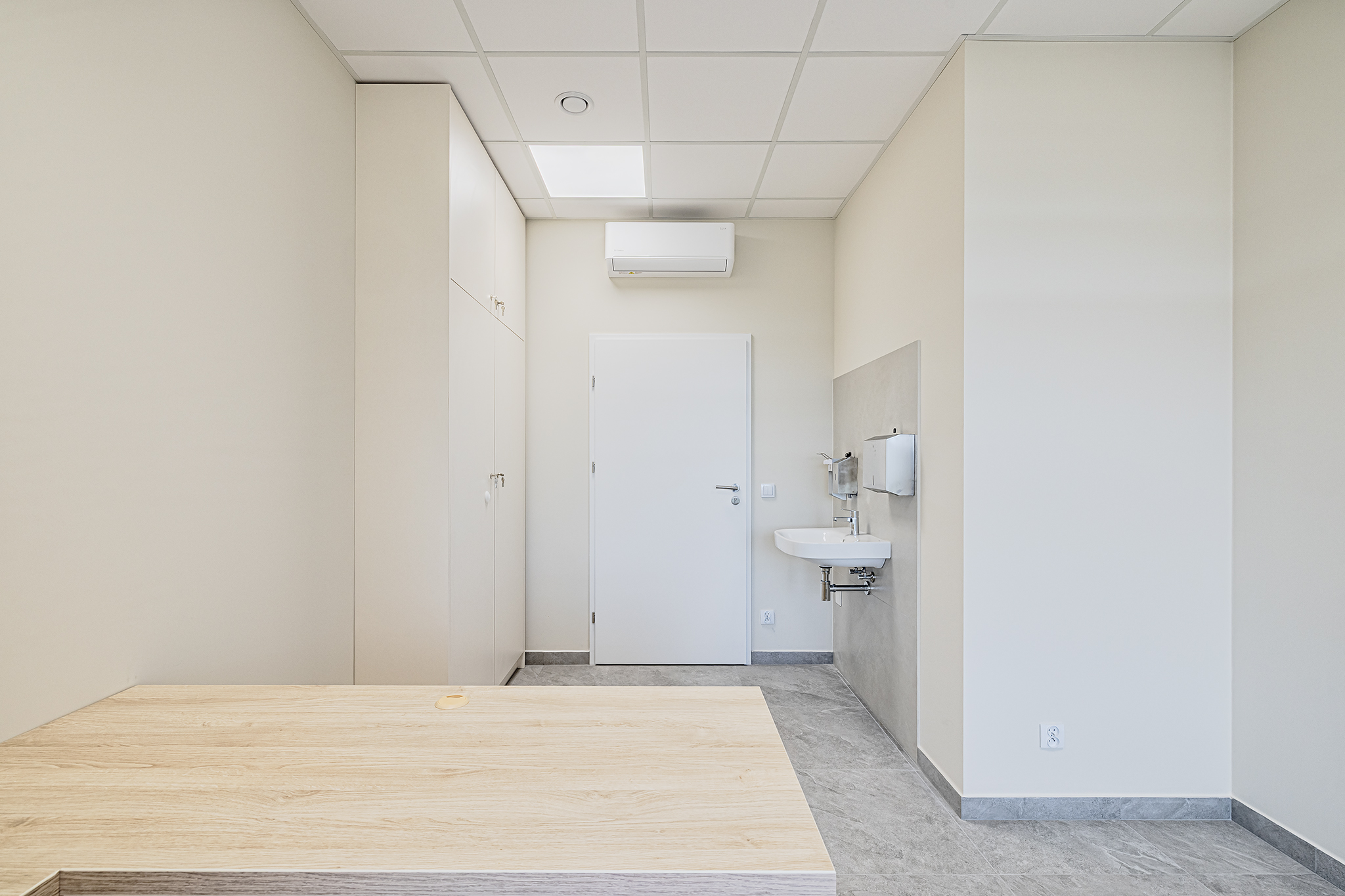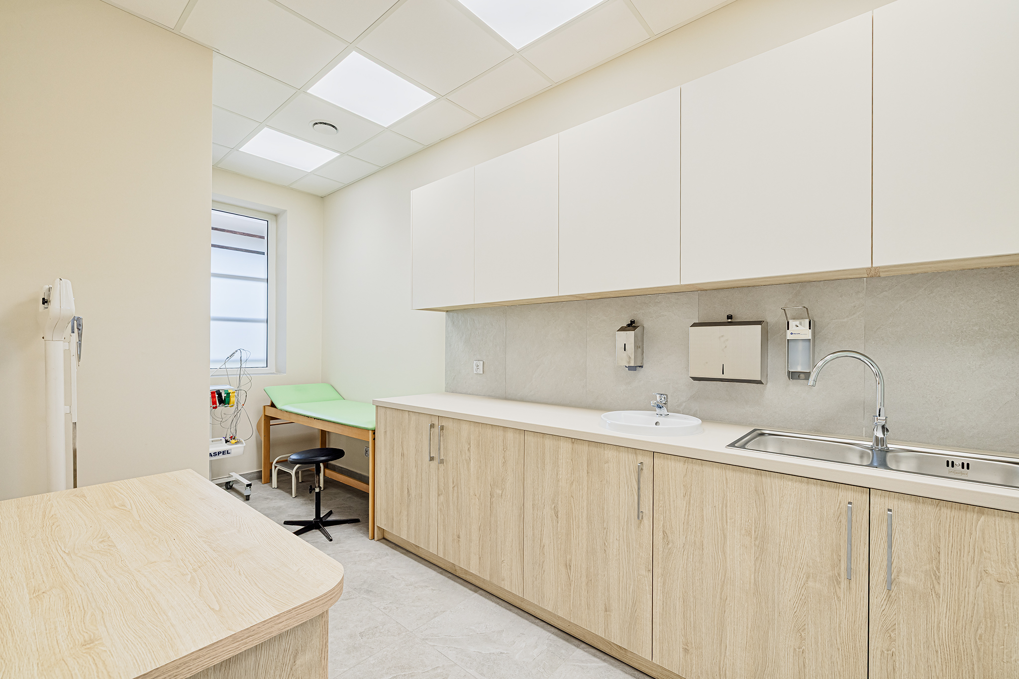Układ pomieszczeń został zaprojektowany z myślą o funkcjonowaniu placówki medycznej i wygodzie użytkowników. Jasne, uporządkowane przestrzenie oraz odpowiednie doświetlenie wpływają pozytywnie na odbiór wnętrza. Zastosowane materiały wykończeniowe są łatwe w utrzymaniu czystości i odporne na intensywne użytkowanie. Sufity podwieszane oraz instalacje zostały zaplanowane tak, aby nie zaburzać przestrzeni i jednocześnie spełniać wymagania techniczne. Całość tworzy środowisko sprzyjające zarówno pracy personelu, jak i komfortowi pacjentów.