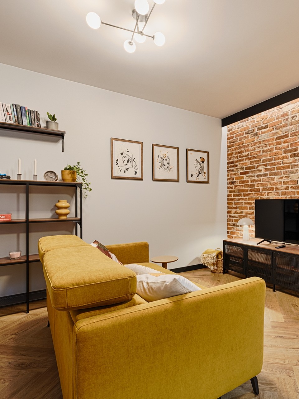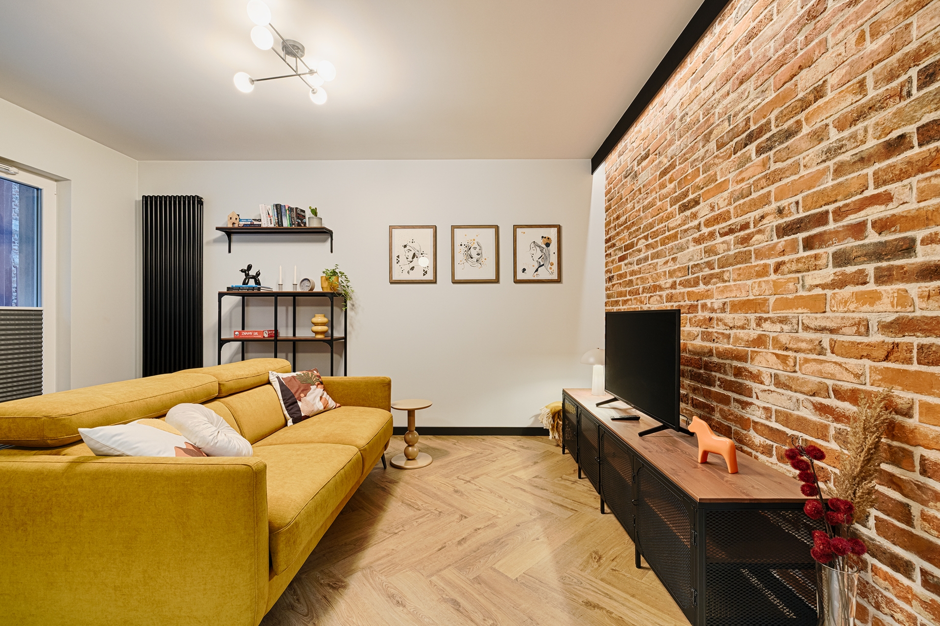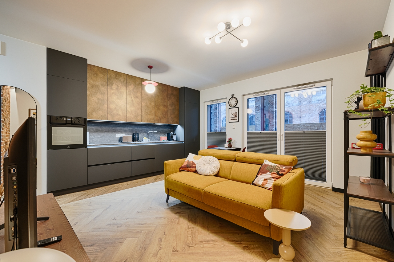 Pofabryczna przestrzeń zobowiązuje do industrialnego wnętrza. Prace wykończeniowe obejmowały wykonanie gładzi i malowania ścian i sufitów; wykonanie kompleksowe łazienki z prysznicem z odwodnieniem liniowym; podłogi klejonej w formacie jodełki z listwami przypodłogowymi oraz biały montaż oświetlenia, gniazd i włączników i grzejników dekoracyjnych. Wisienką na torcie tej przestrzeni to ściana telewizyjna wykończona z odzyskanej cegły.
