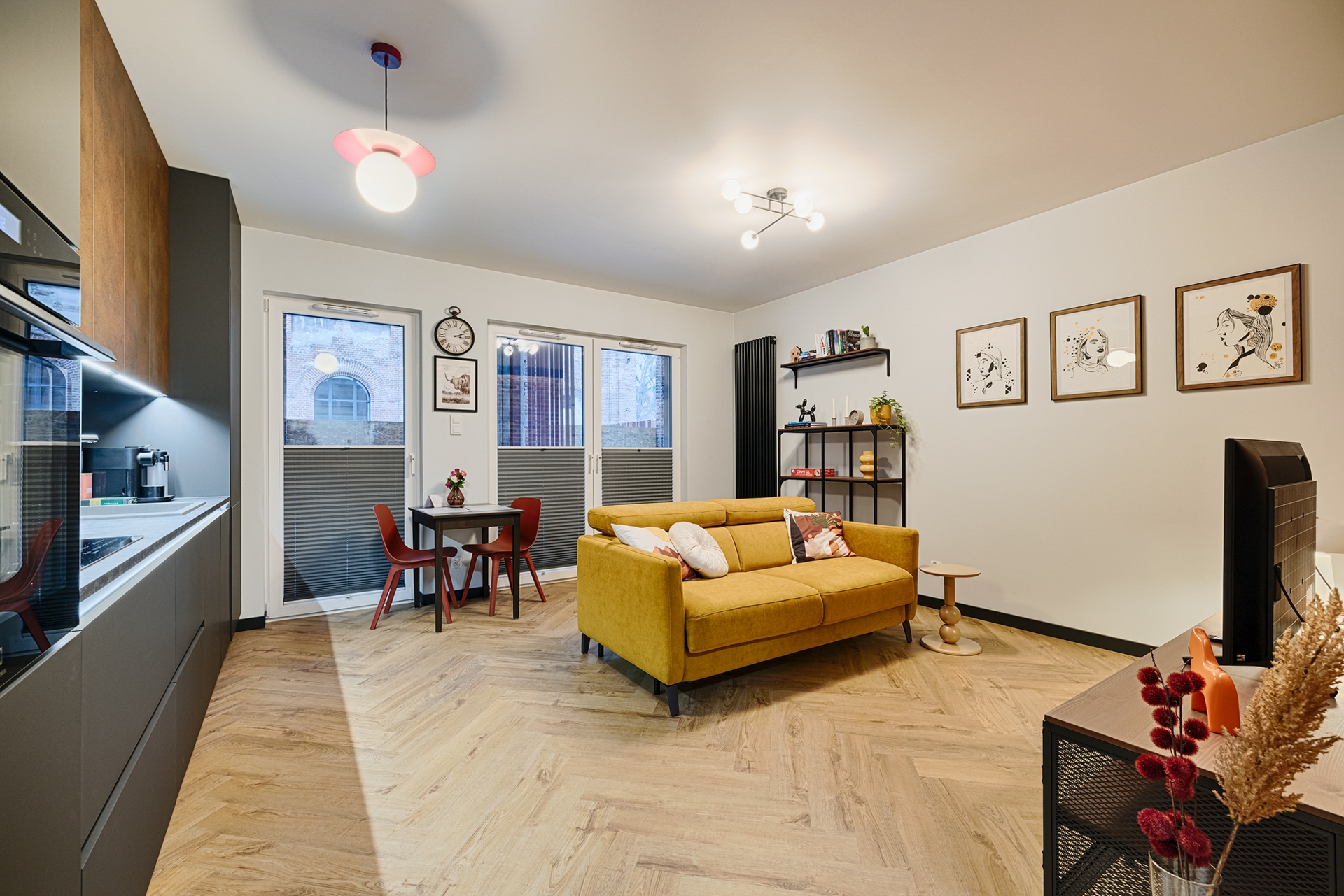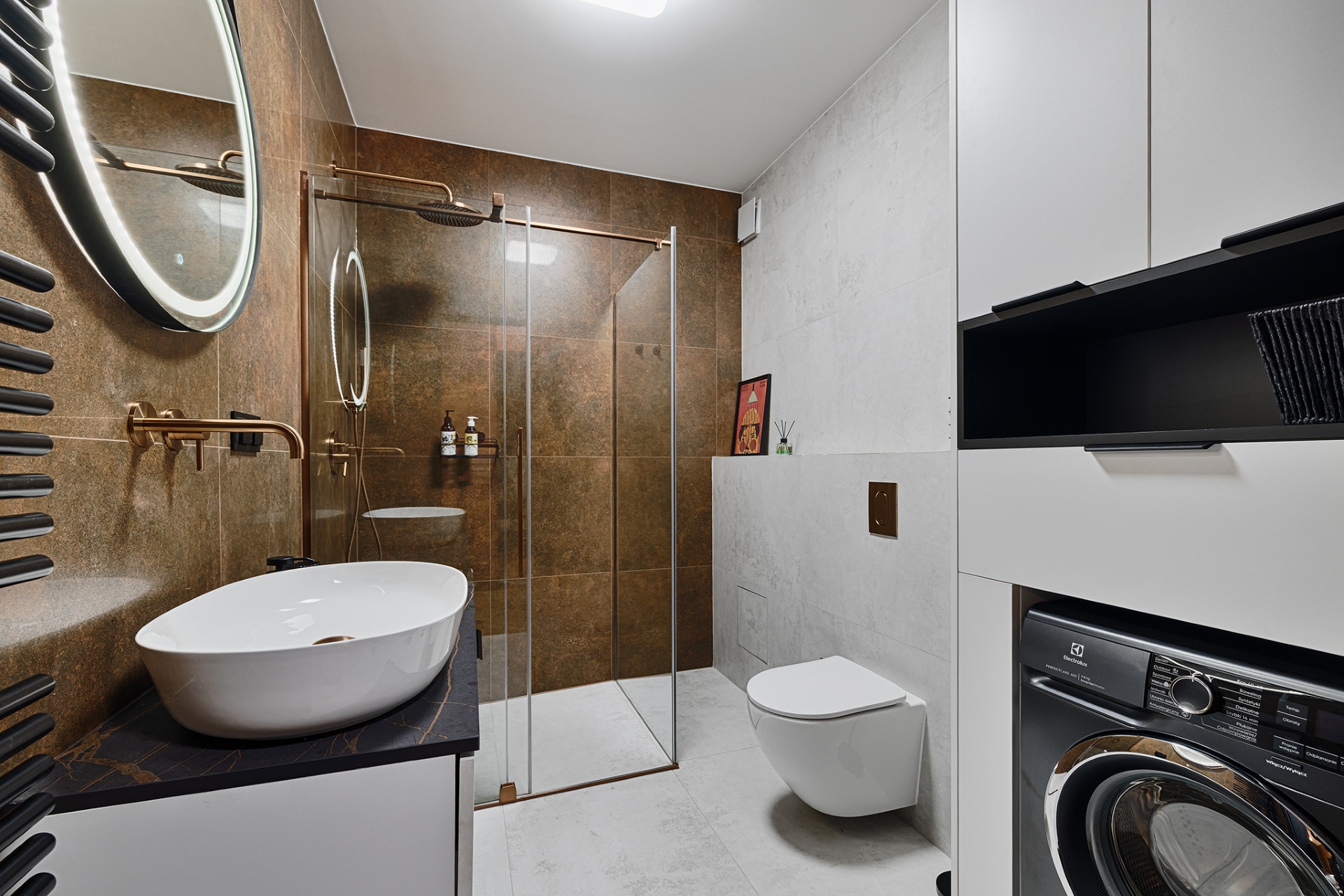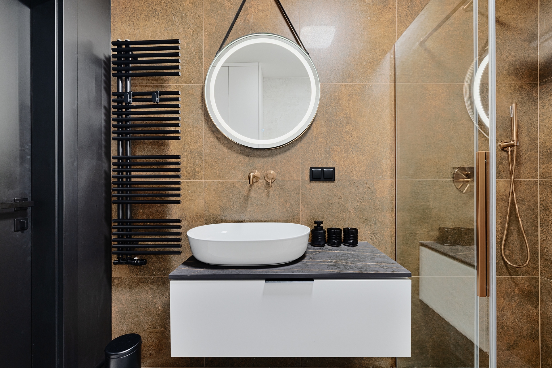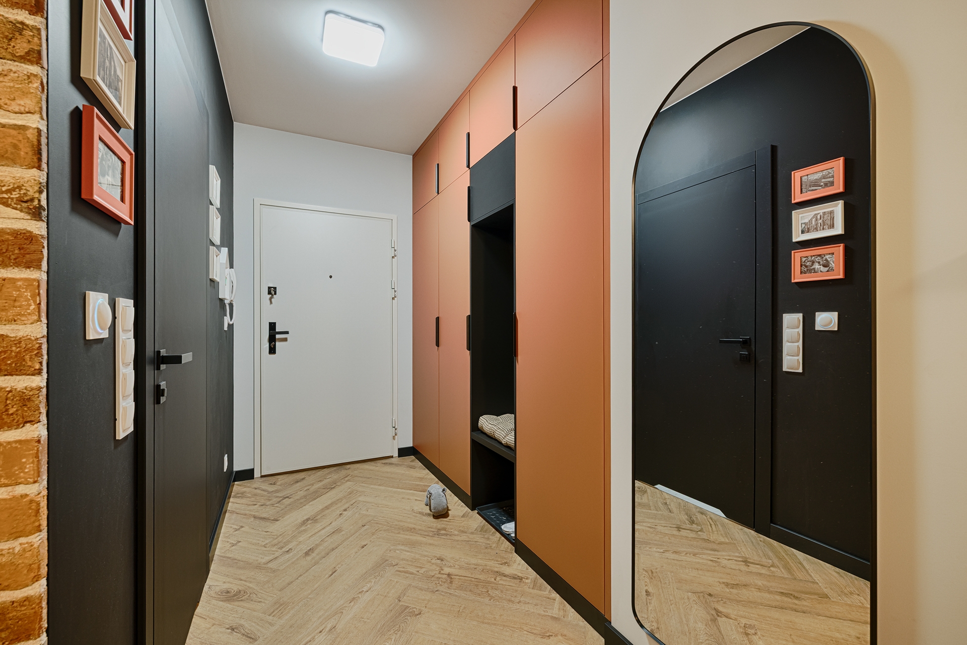 Dopełnieniem prac było zamontowanie drzwi wewnętrznych oraz uchwytów, wykończenie listew przyściennych w całym mieszkaniu, a także montaż osprzętu elektrycznego i grzejników dekoracyjnych w sposób spójny z industrialnym charakterem przestrzeni.
