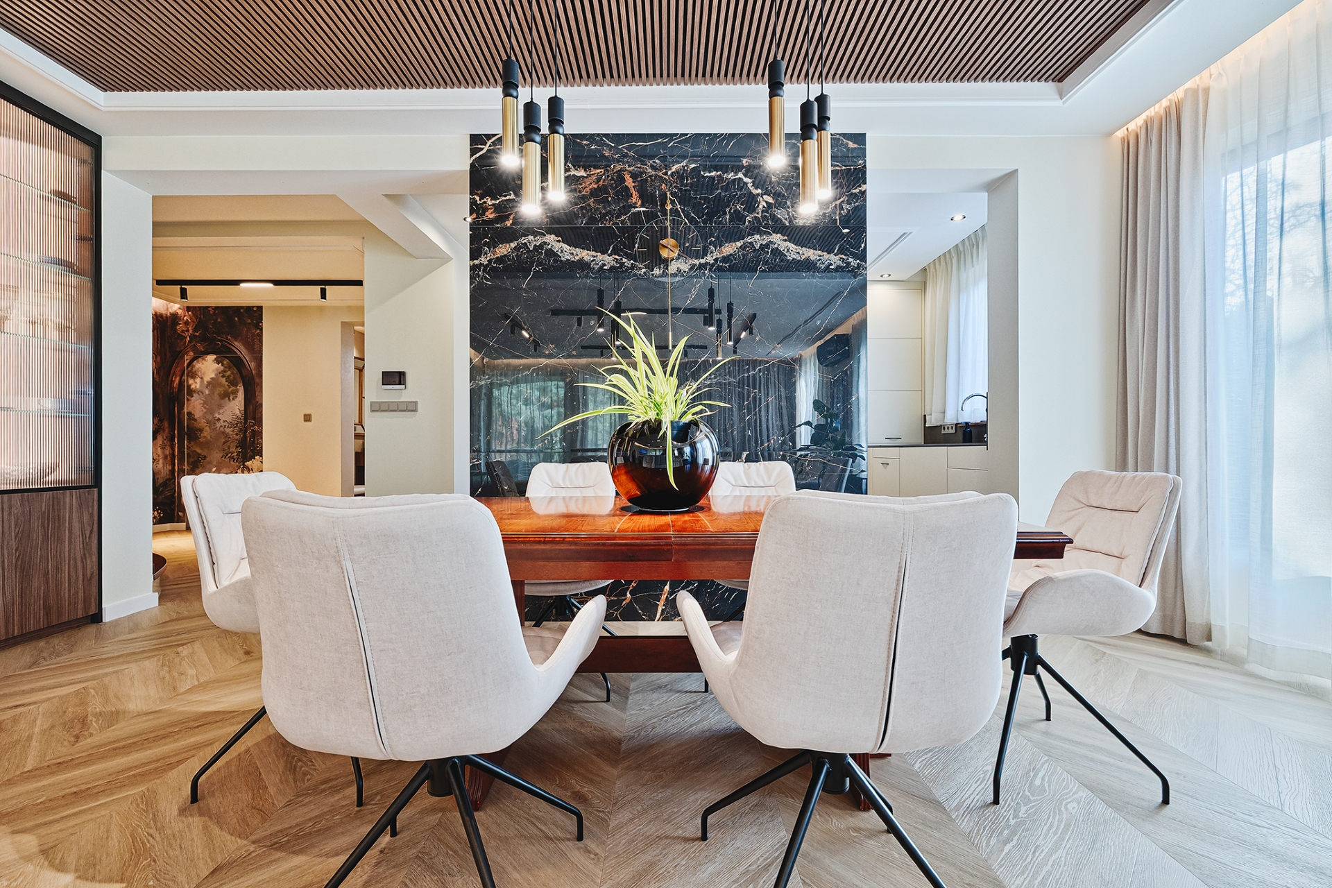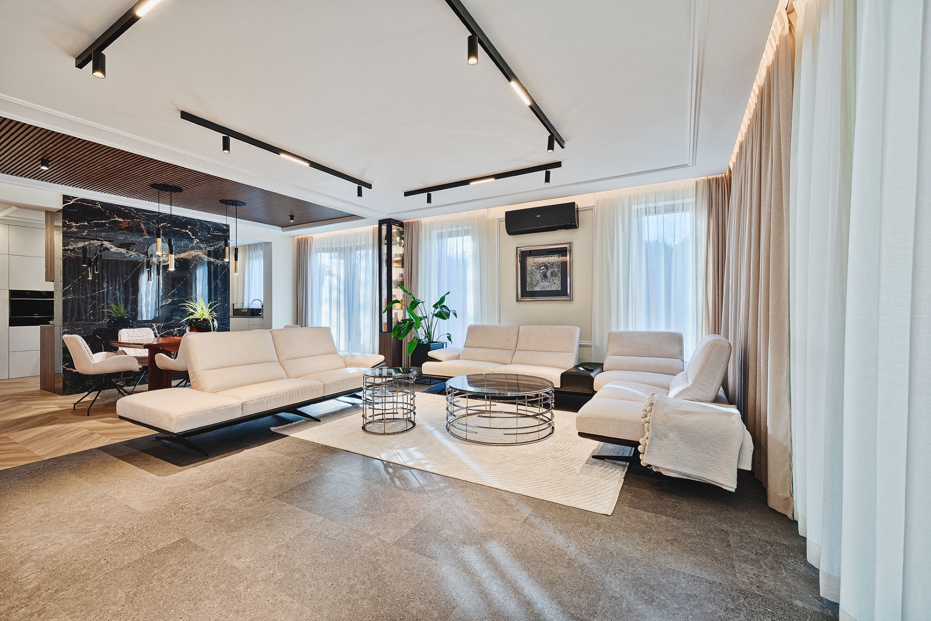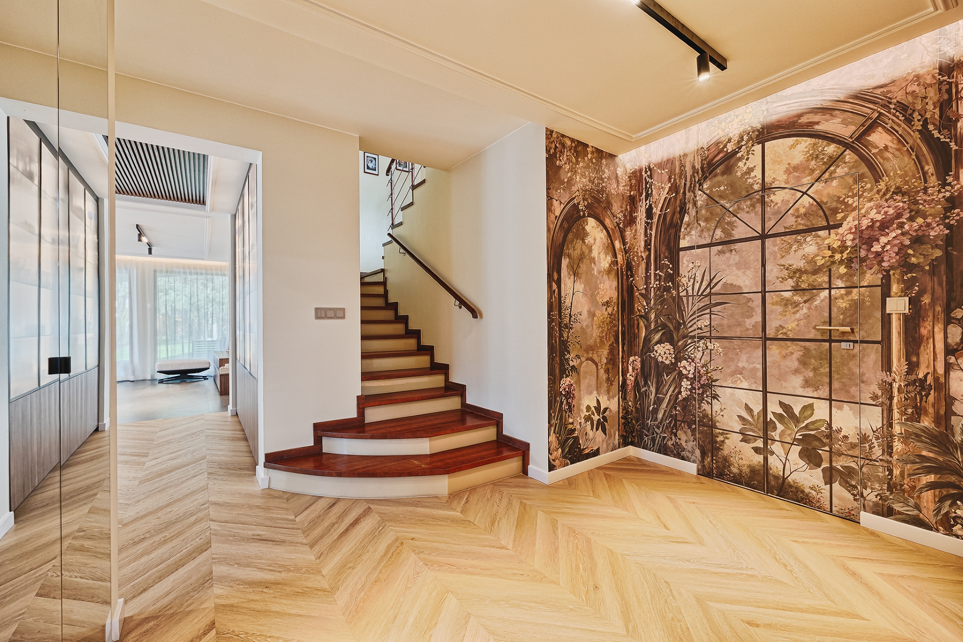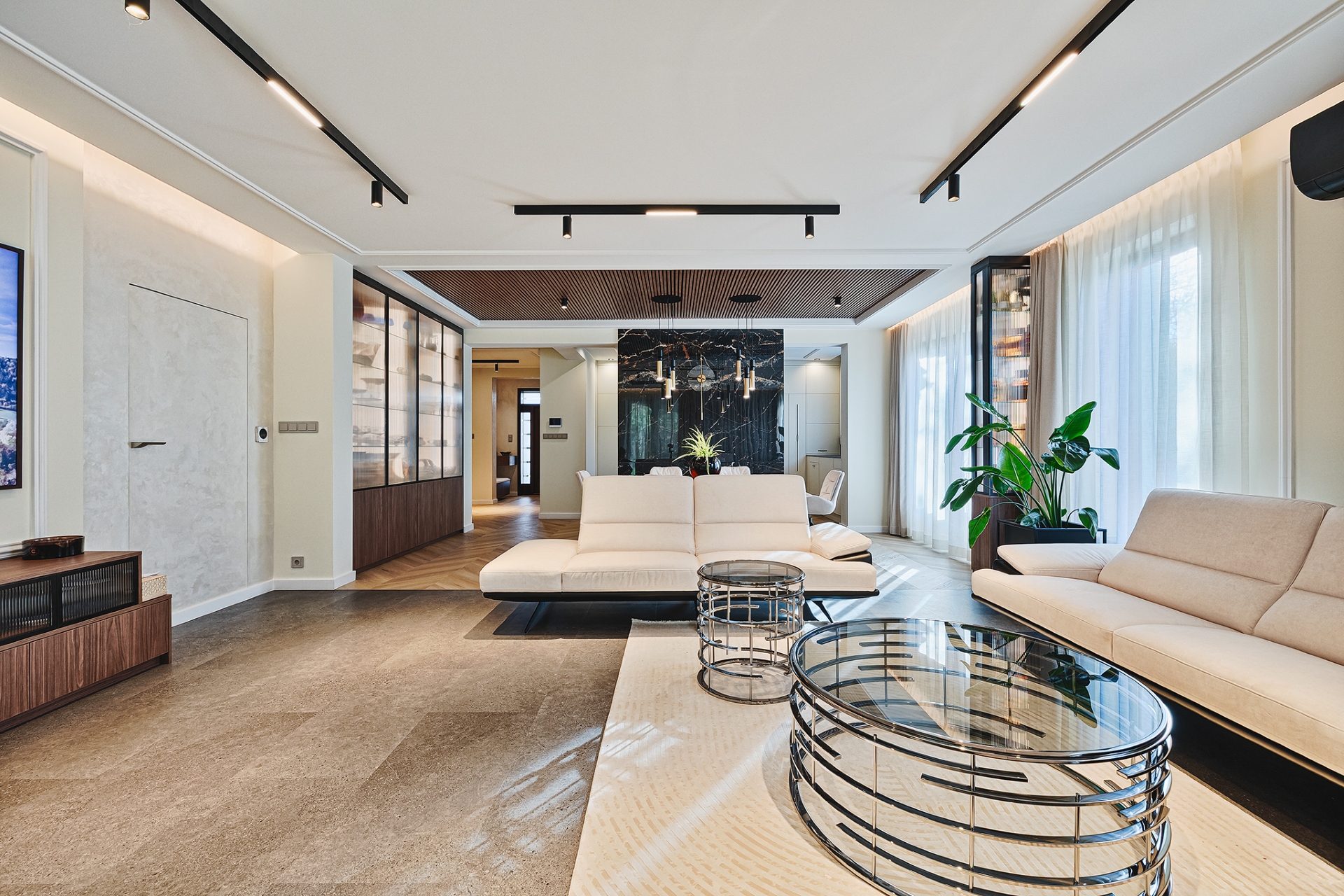 Wnętrza łączą nowoczesne rozwiązania z eleganckimi detalami, tworząc harmonijną przestrzeń o spójnym charakterze. Gładkie ściany pomalowane farbami dekoracyjnymi nadają pomieszczeniom lekkości, a sztukateria i półki w sufitach podwieszanych podkreślają estetykę każdego pomieszczenia. Podłogi w technologii klejonej, w wariantach jodełki francuskiej i imitacji gresu, wprowadzają naturalny rytm i ciepło wnętrza. Oświetlenie LED w połączeniu z szynoprzewodami tworzy przyjemną atmosferę oraz podkreśla elementy architektoniczne. Industrialne i dekoracyjne detale zostały dobrane tak, aby całość była elegancka, a jednocześnie funkcjonalna.