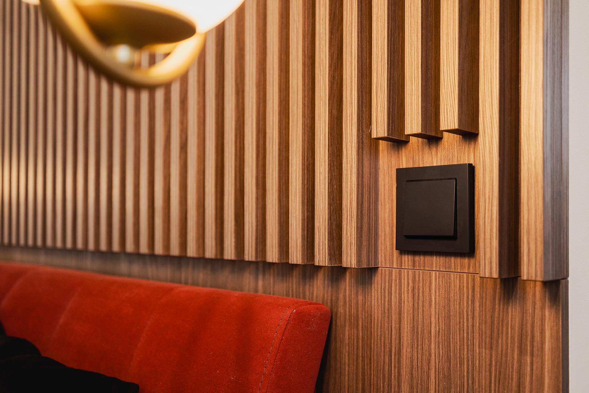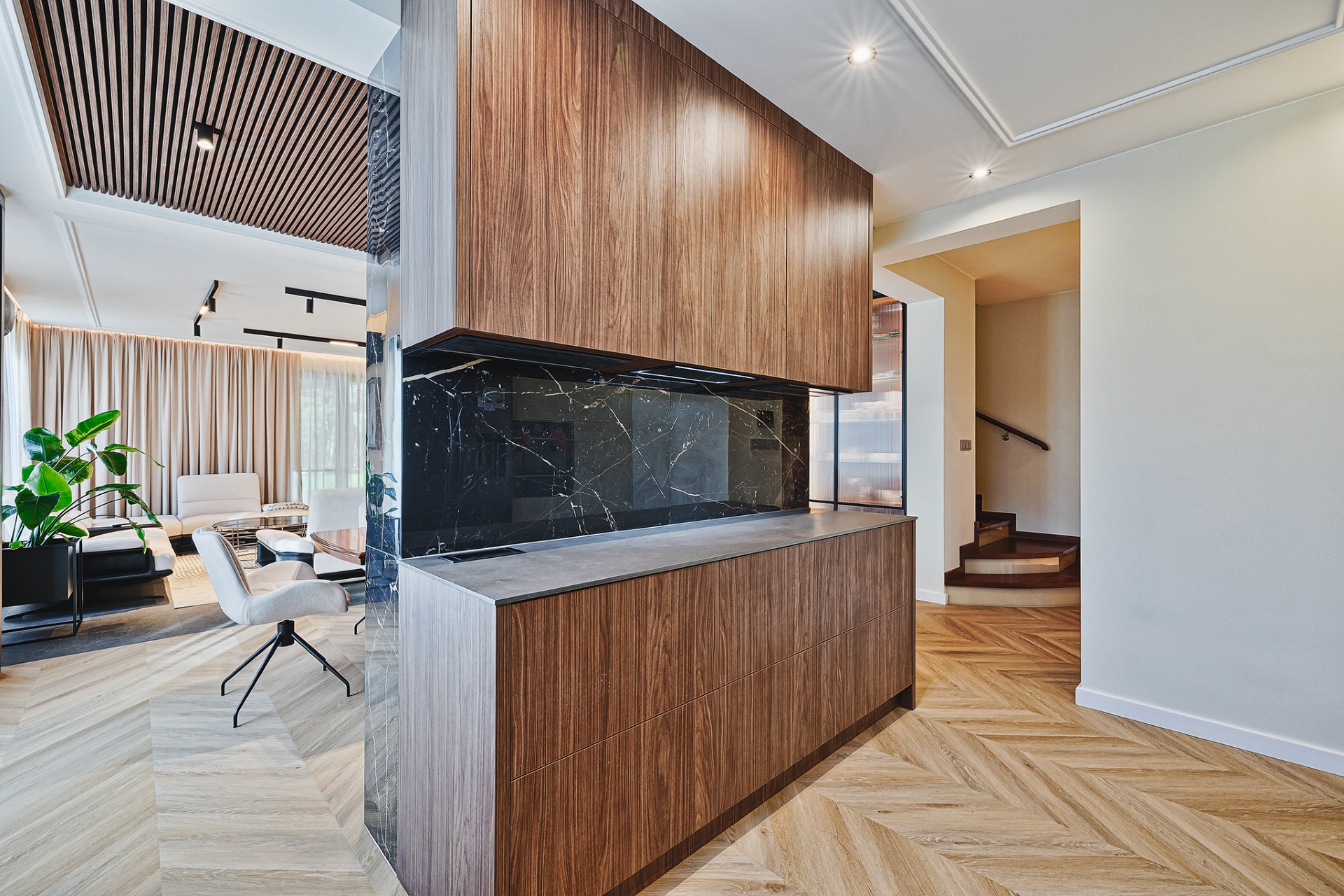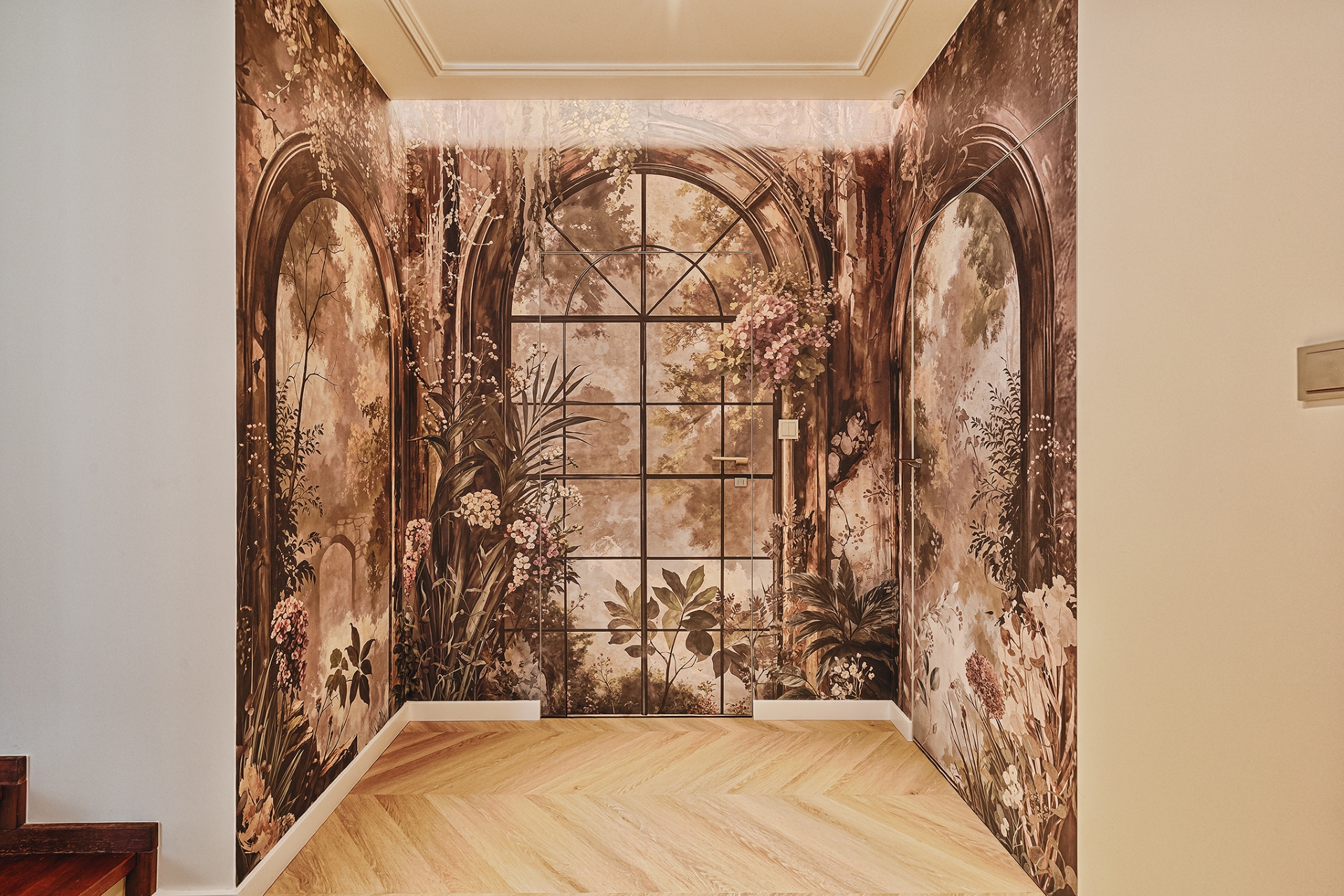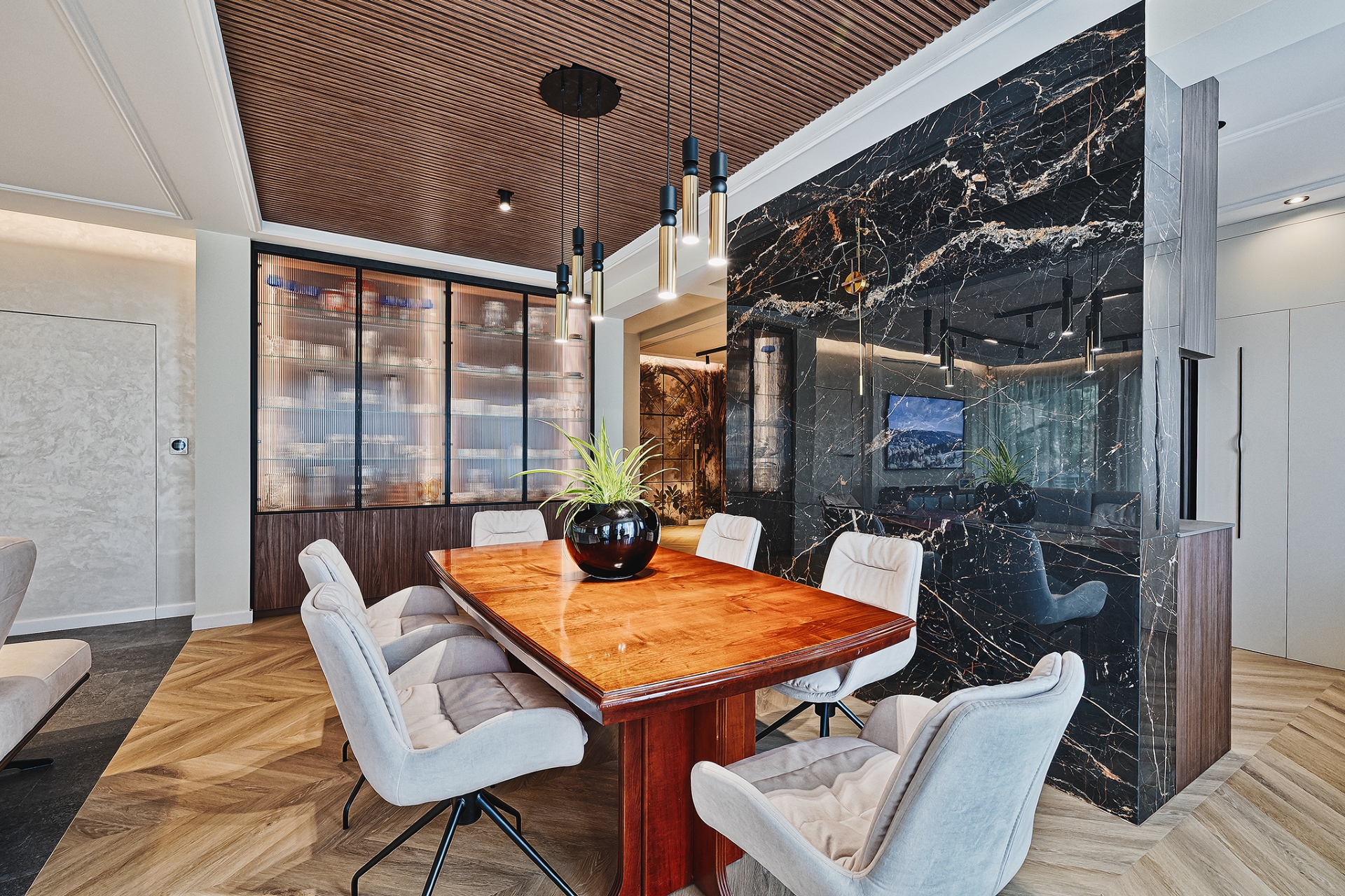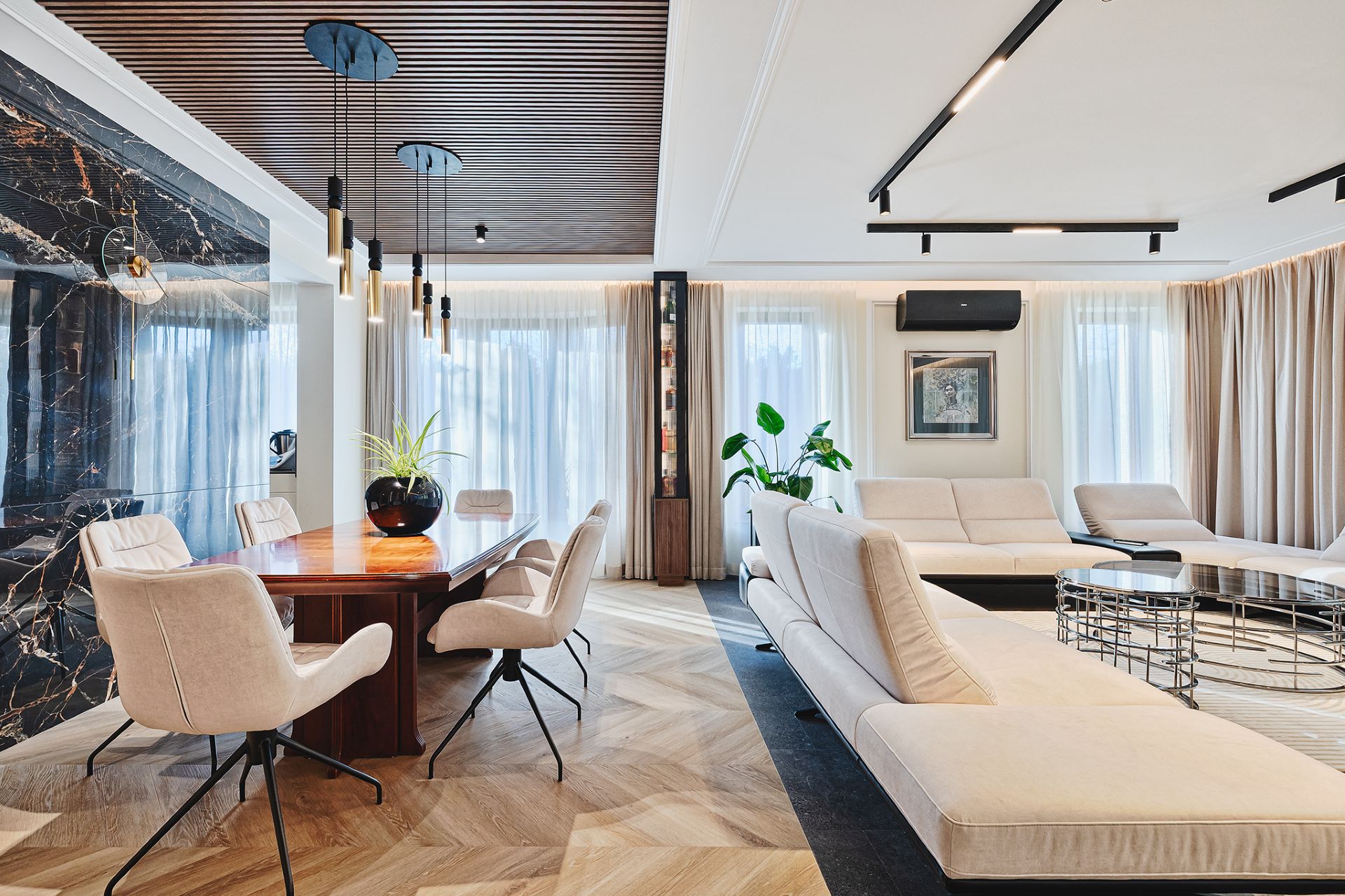 Wnętrza łączą nowoczesne rozwiązania z eleganckimi detalami, tworząc harmonijną przestrzeń o spójnym charakterze. Gładkie ściany pomalowane farbami dekoracyjnymi nadają pomieszczeniom lekkości, a sztukateria i półki w sufitach podwieszanych podkreślają estetykę każdego pomieszczenia. Podłogi w technologii klejonej, w wariantach jodełki francuskiej i imitacji gresu, wprowadzają naturalny rytm i ciepło wnętrza. Oświetlenie LED w połączeniu z szynoprzewodami tworzy przyjemną atmosferę oraz podkreśla elementy architektoniczne. Industrialne i dekoracyjne detale zostały dobrane tak, aby całość była elegancka, a jednocześnie funkcjonalna.