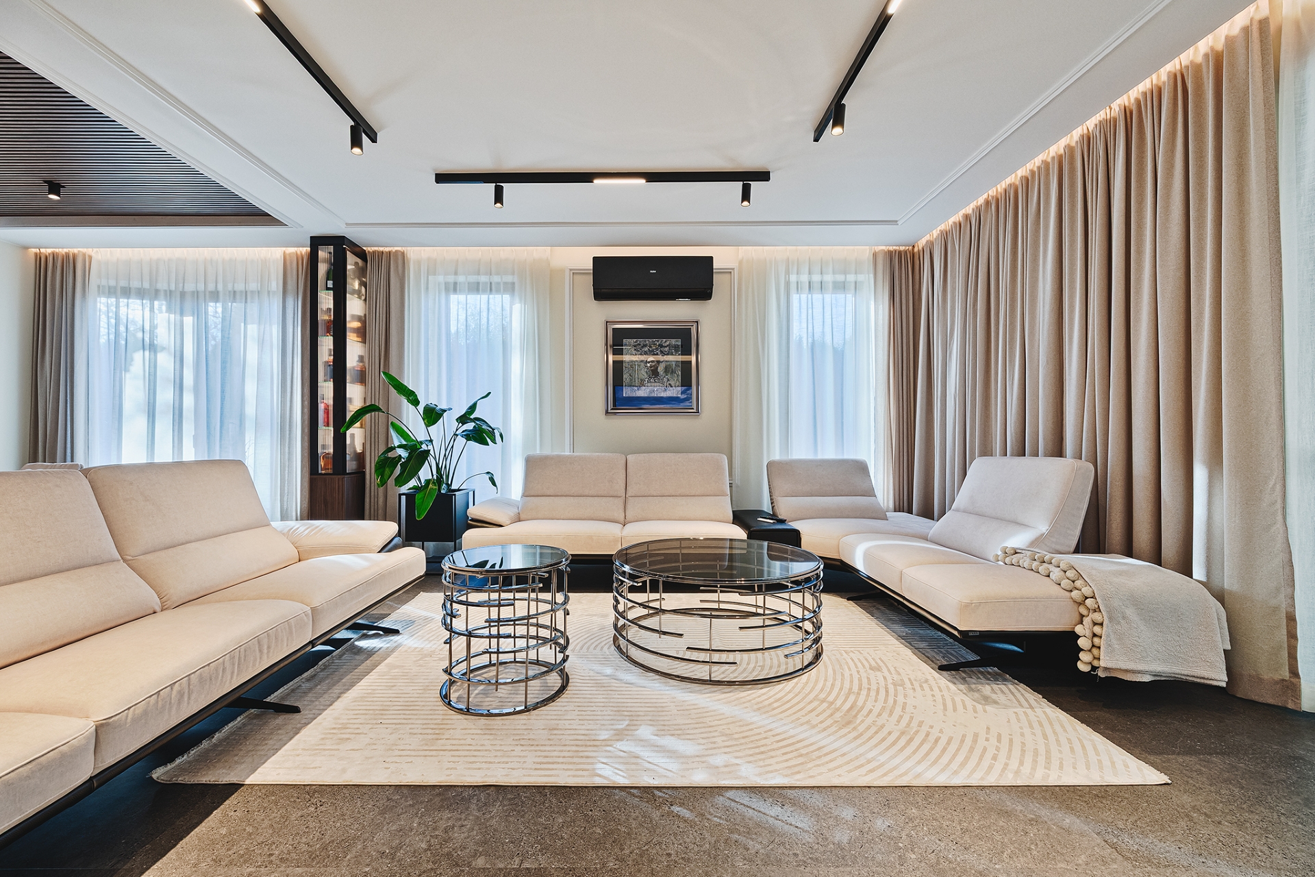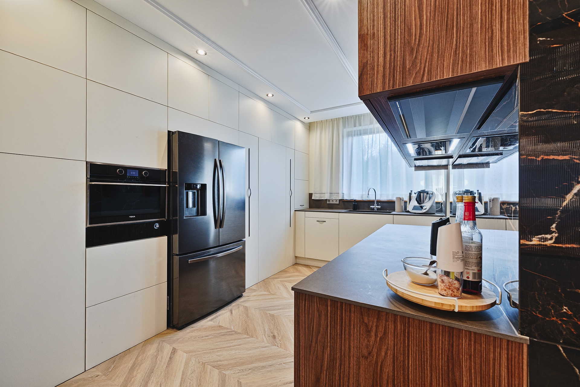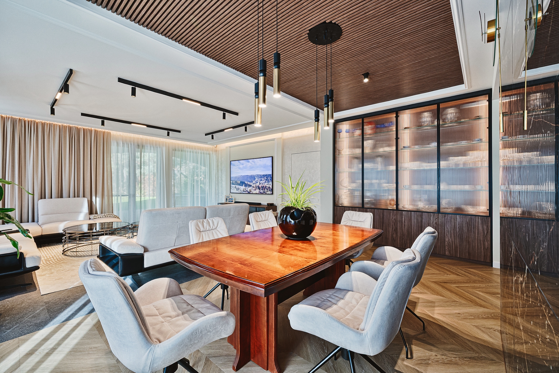 Projekt zakłada pełną wygodę użytkowania przestrzeni, w tym nową instalację elektryczną i sanitarną oraz adaptację pod systemy smart home. Podłogi winylowe klejone zapewniają trwałość i komfort codziennego użytkowania. Sufity podwieszane z półkami i blendami pod oświetlenie LED umożliwiają elastyczne sterowanie światłem w każdym pomieszczeniu. Rozmieszczenie łazienek i kotłowni zostało zoptymalizowane pod kątem funkcjonalności, a wszystkie elementy wyposażenia są łatwe w obsłudze. Dzięki przemyślanemu układowi i dopracowanym detalom wnętrze jest wygodne, praktyczne i dostosowane do potrzeb mieszkańców.