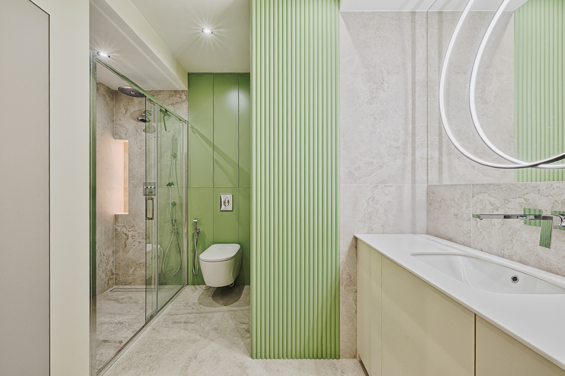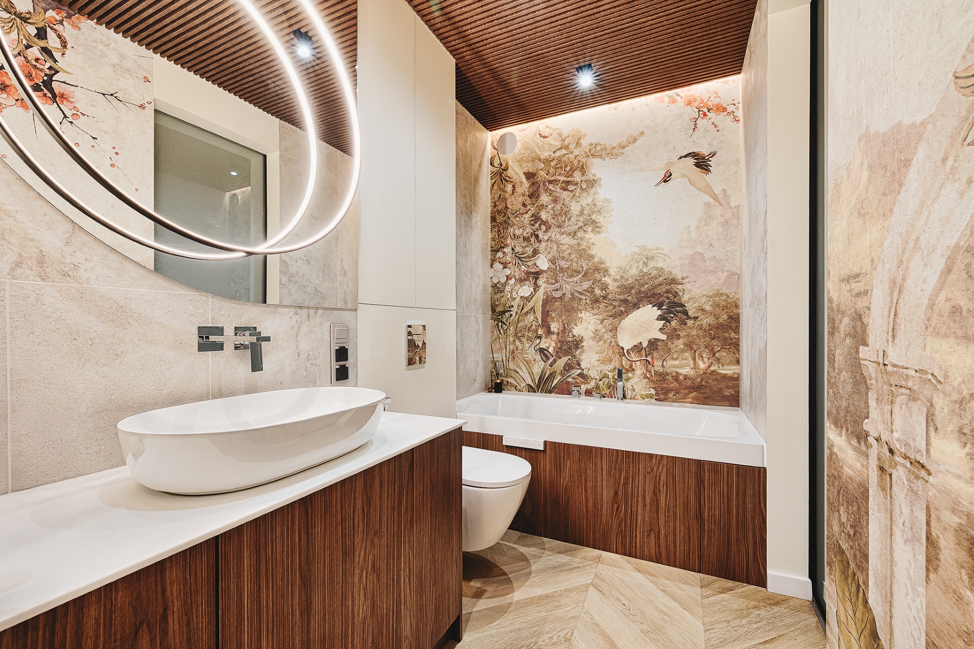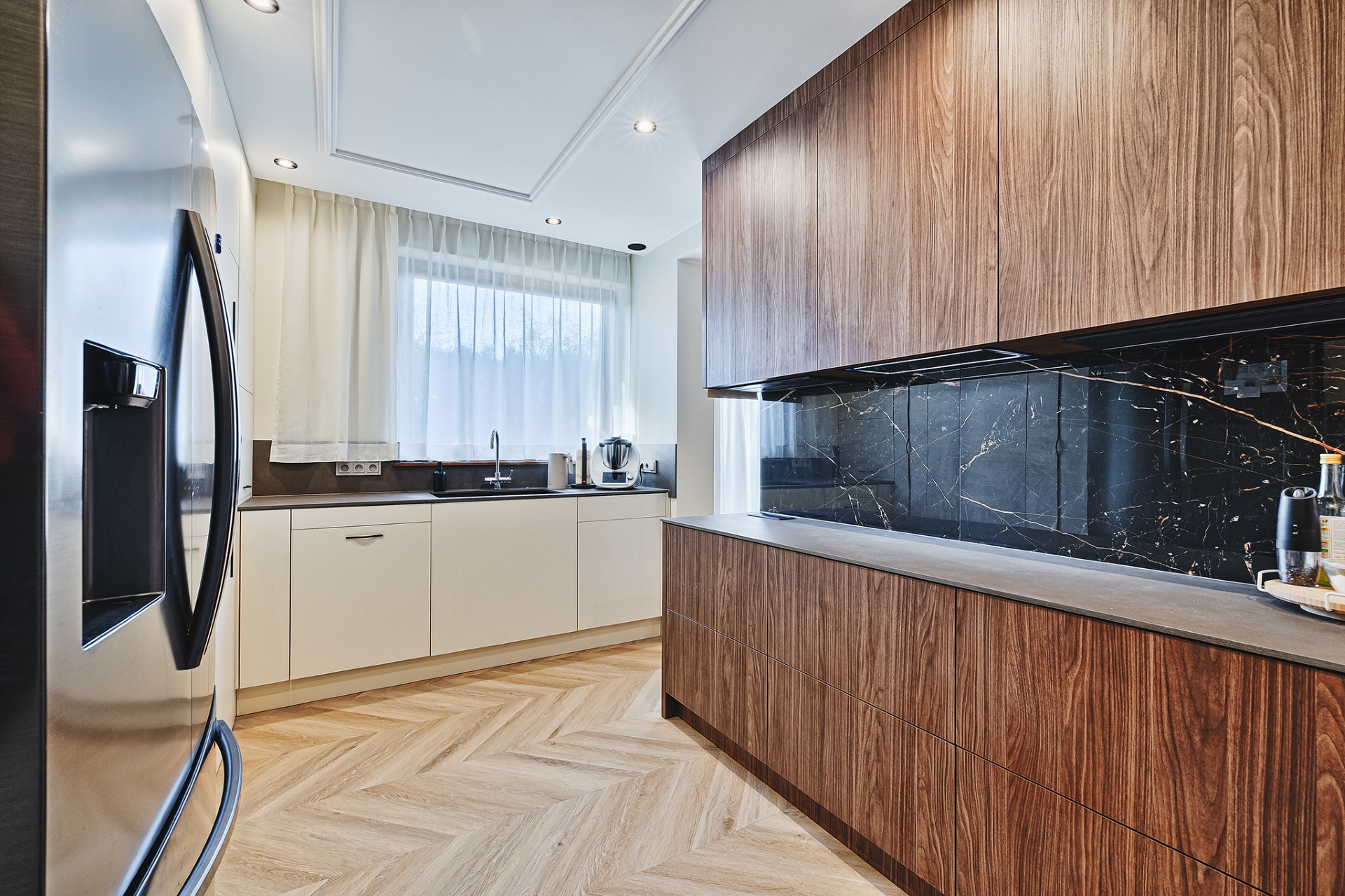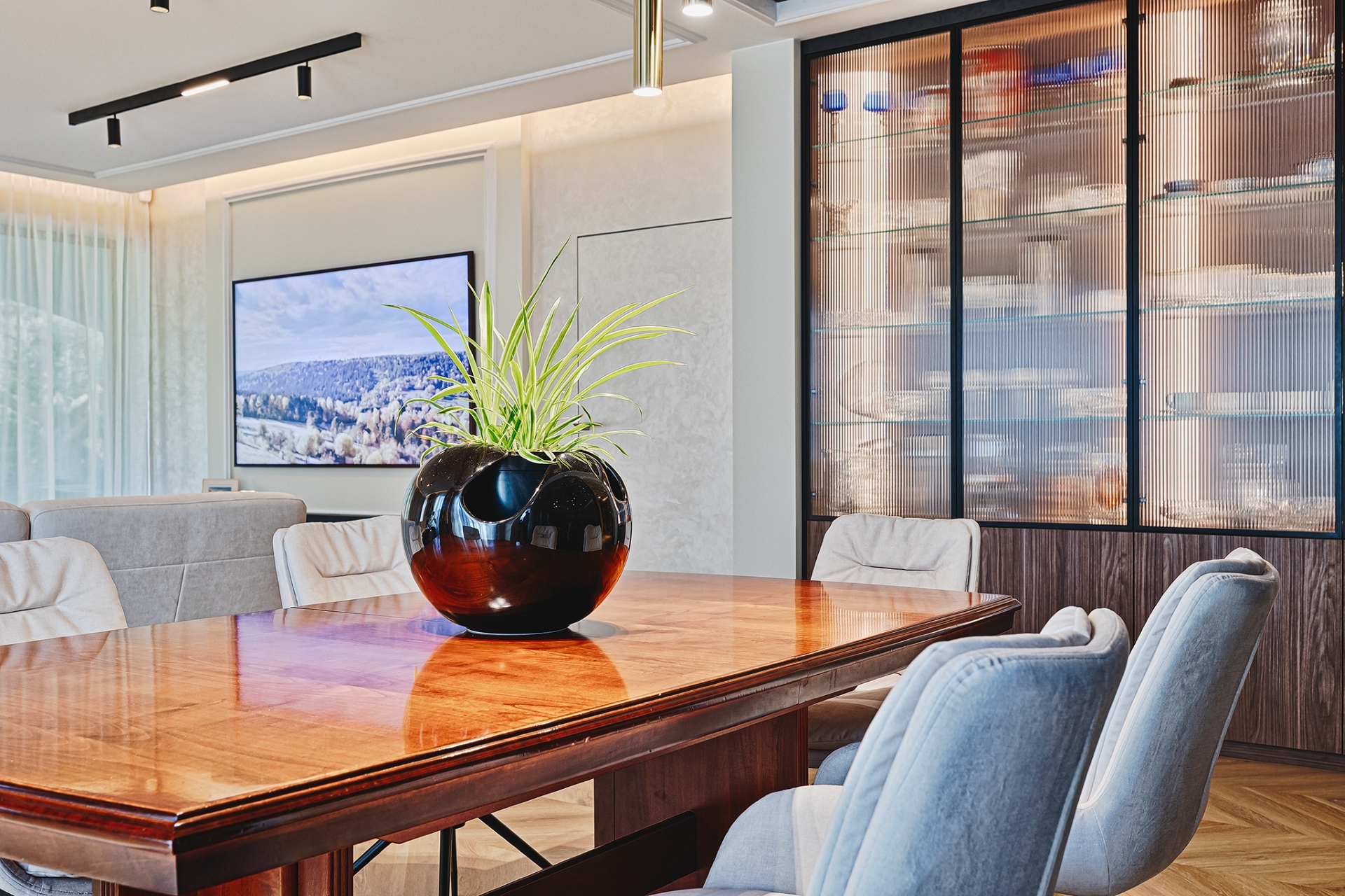 Projekt zakłada pełną wygodę użytkowania przestrzeni, w tym nową instalację elektryczną i sanitarną oraz adaptację pod systemy smart home. Podłogi winylowe klejone zapewniają trwałość i komfort codziennego użytkowania. Sufity podwieszane z półkami i blendami pod oświetlenie LED umożliwiają elastyczne sterowanie światłem w każdym pomieszczeniu. Rozmieszczenie łazienek i kotłowni zostało zoptymalizowane pod kątem funkcjonalności, a wszystkie elementy wyposażenia są łatwe w obsłudze. Dzięki przemyślanemu układowi i dopracowanym detalom wnętrze jest wygodne, praktyczne i dostosowane do potrzeb mieszkańców.