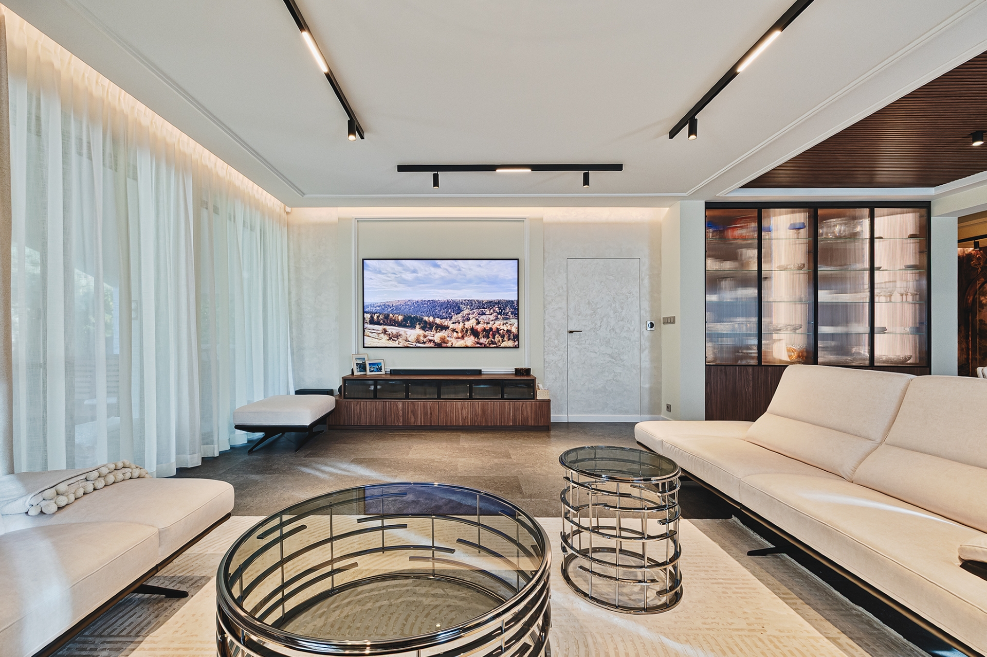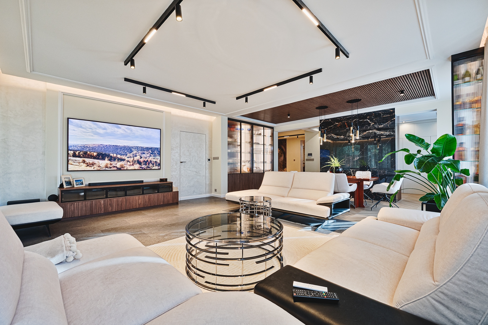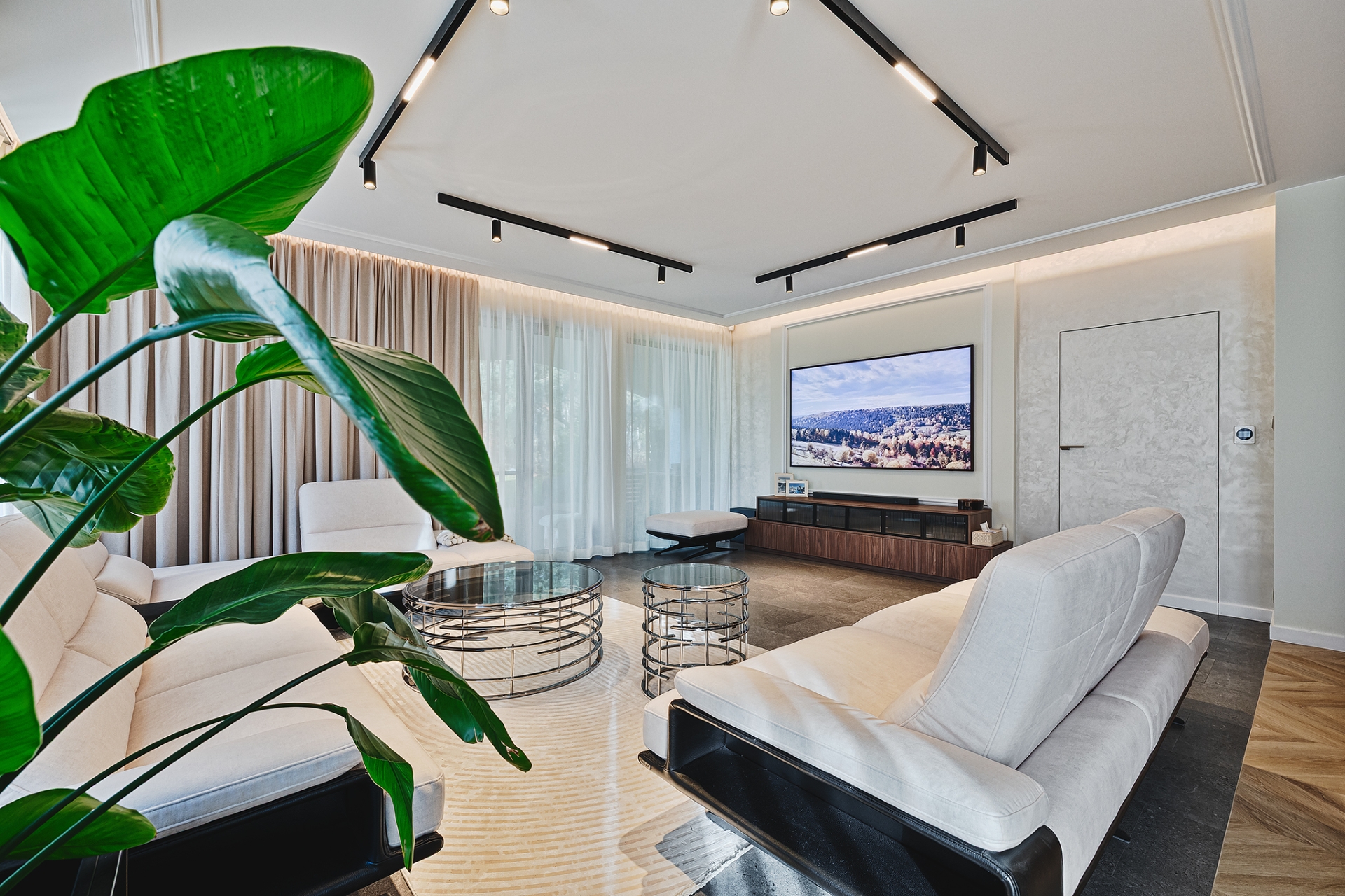Rozprowadziliśmy nową instalację elektryczną z adaptacją pod możliwość montażu modułów smart home oraz białym montażem oświetlenia w tym szynoprzewody i paski LEDowe. Zamontowaliśmy sufity podwieszane z różnymi wysokościami oraz półkami i blendami pod oświetlenie LED.