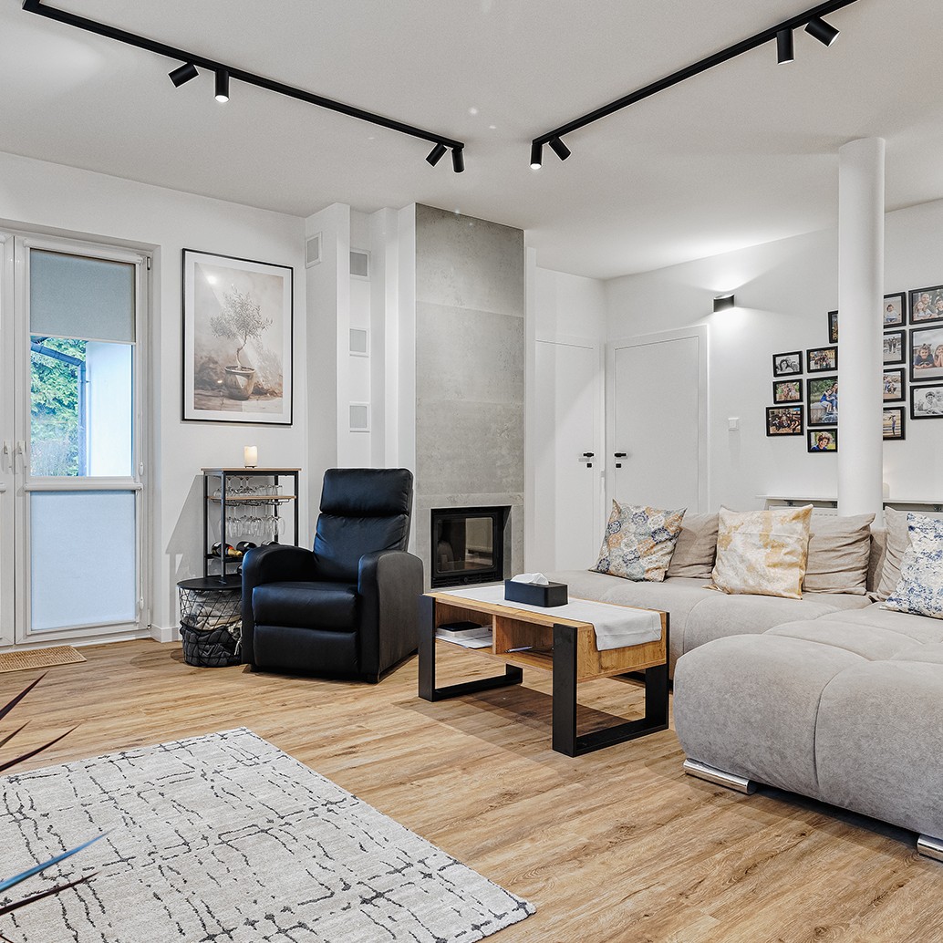 W ramach inwestycji wykonaliśmy pełen zakres prac wykończeniowych. Prace rozpoczęliśmy od adaptacji instalacji elektrycznej i sanitarnej. Wykończenia polegały na wykonaniu gładzi i malowania ścian i sufitów obejmujące również półokrągłą klatkę schodową; dwóch w pełni wyposażonych łazienek; podłogi pływającej z listwowaniem oraz montażu oświetlenia w tym szynoprzewodów. Dodatkowo w ramach prac przeprowadzaliśmy adaptacje instalacji teletechnicznej, taras wentylowany oraz renowacje elewacji zewnętrznej z podbitką.