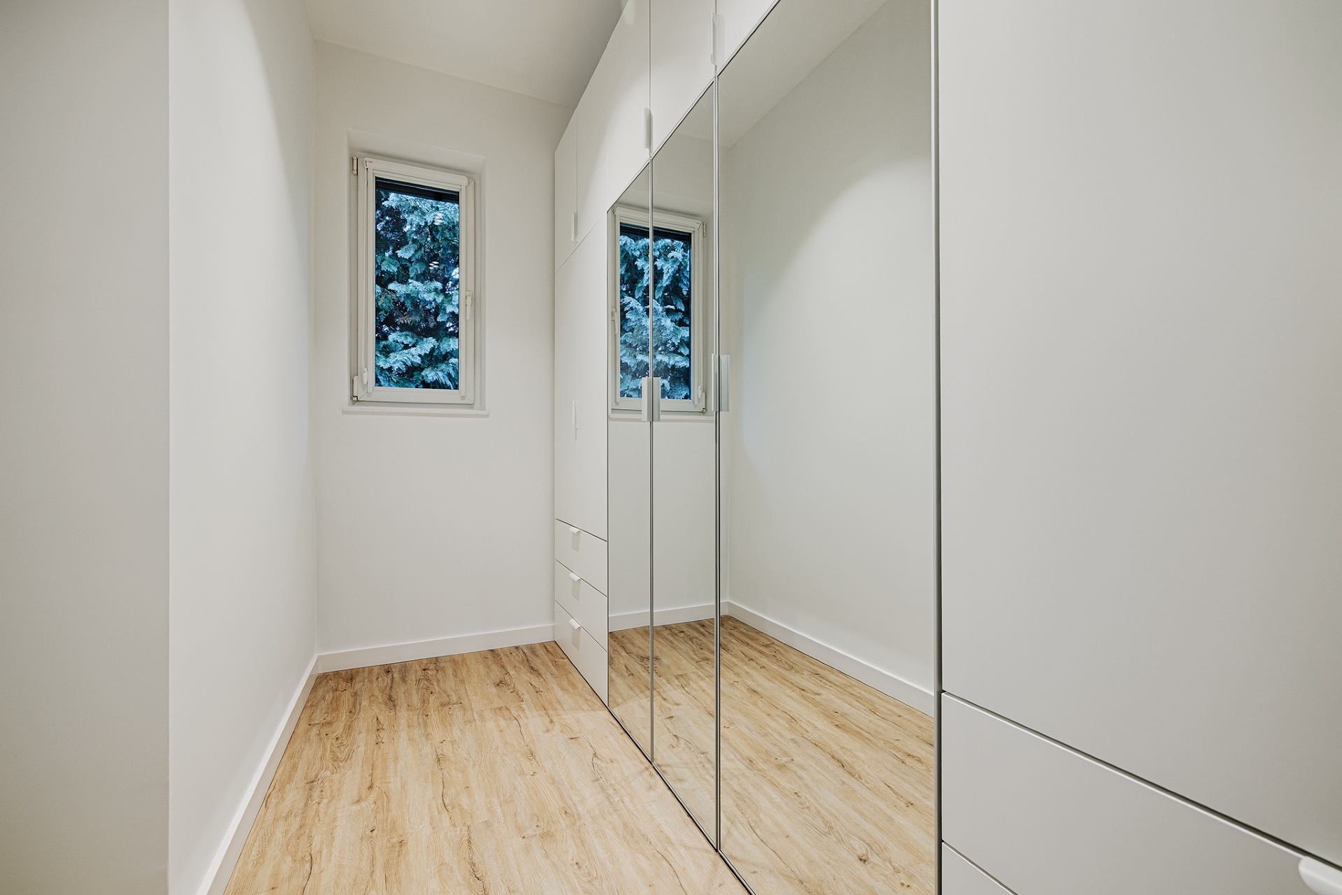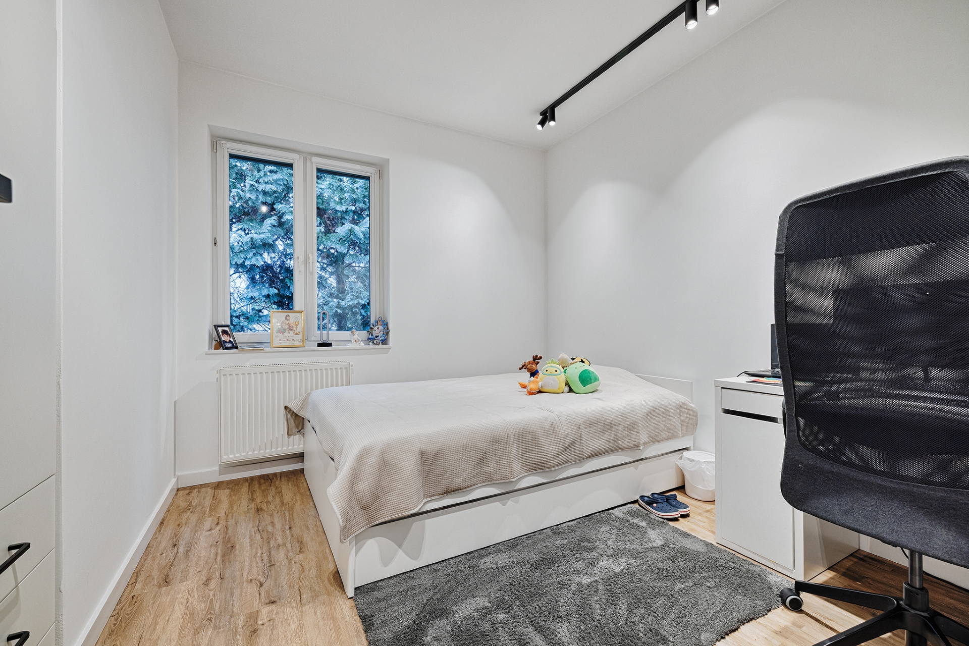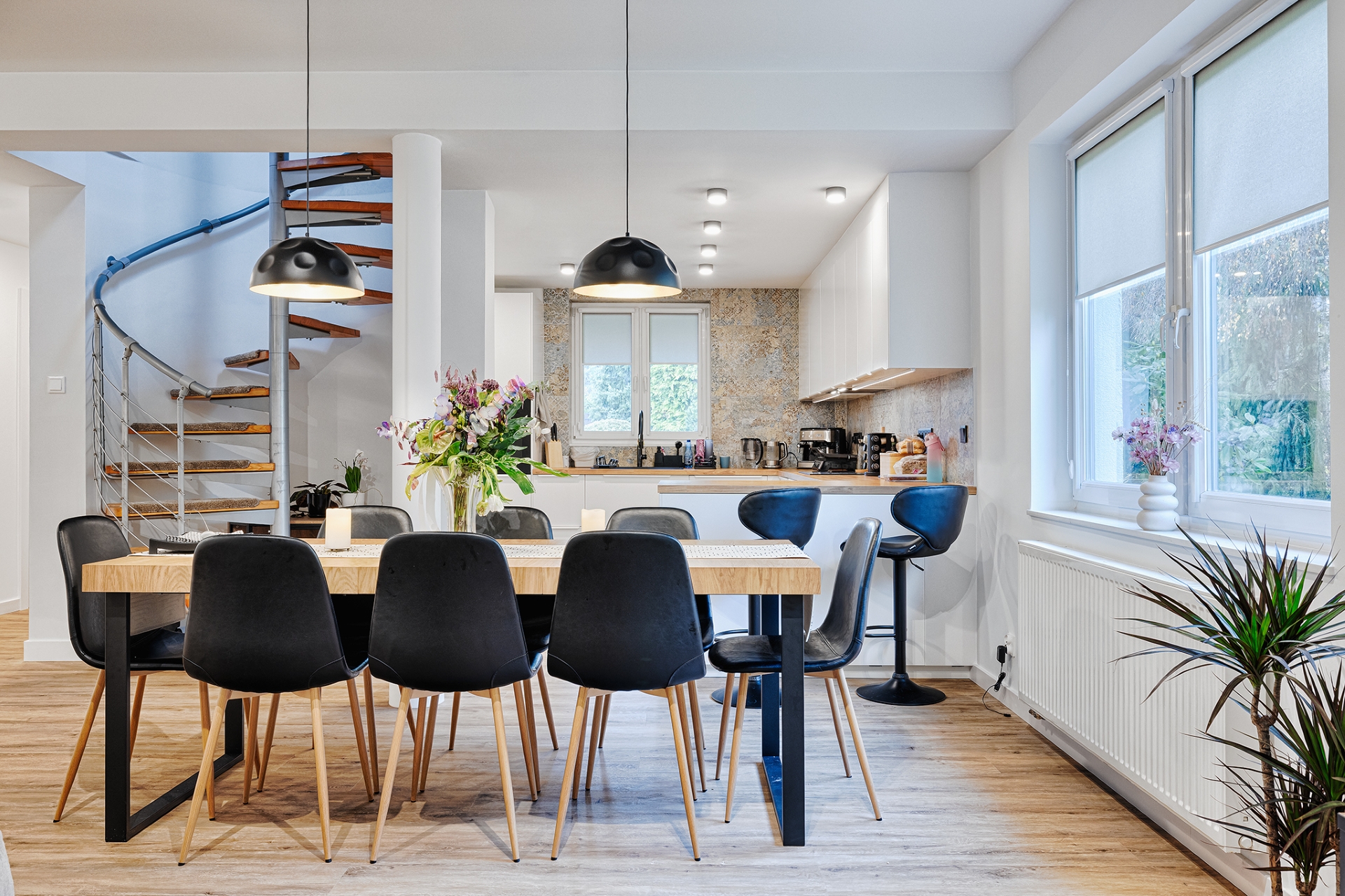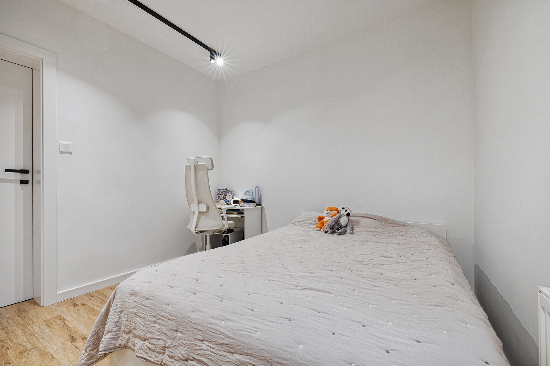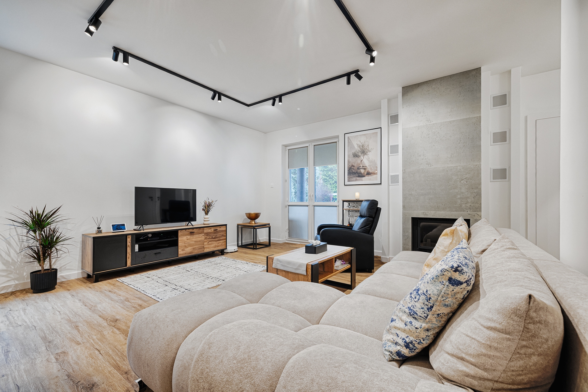 Prace uzupełniające obejmowały montaż drzwi wewnętrznych, wykończenie listew przypodłogowych oraz instalację osprzętu elektrycznego i grzejników w sposób spójny z nowoczesnym charakterem inwestycji.